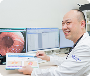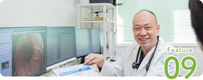 内視鏡(胃カメラ・大腸カメラ)検査は、大分大学病院、九州大学別府病院、新別府病院から消化器内視鏡専門医を持つ先生方にも手伝っていただき、専門施設と同等のレベルで行っています。CT検査では、全例を放射線科専門医が読影し、胸部レントゲン検査では富士フイルム社のAI技術(CXR-AID)を活用しています。超音波(エコー)検査については、経験豊富な臨床検査技師が担当しており、これらの体制によりがんの早期発見に努めています。